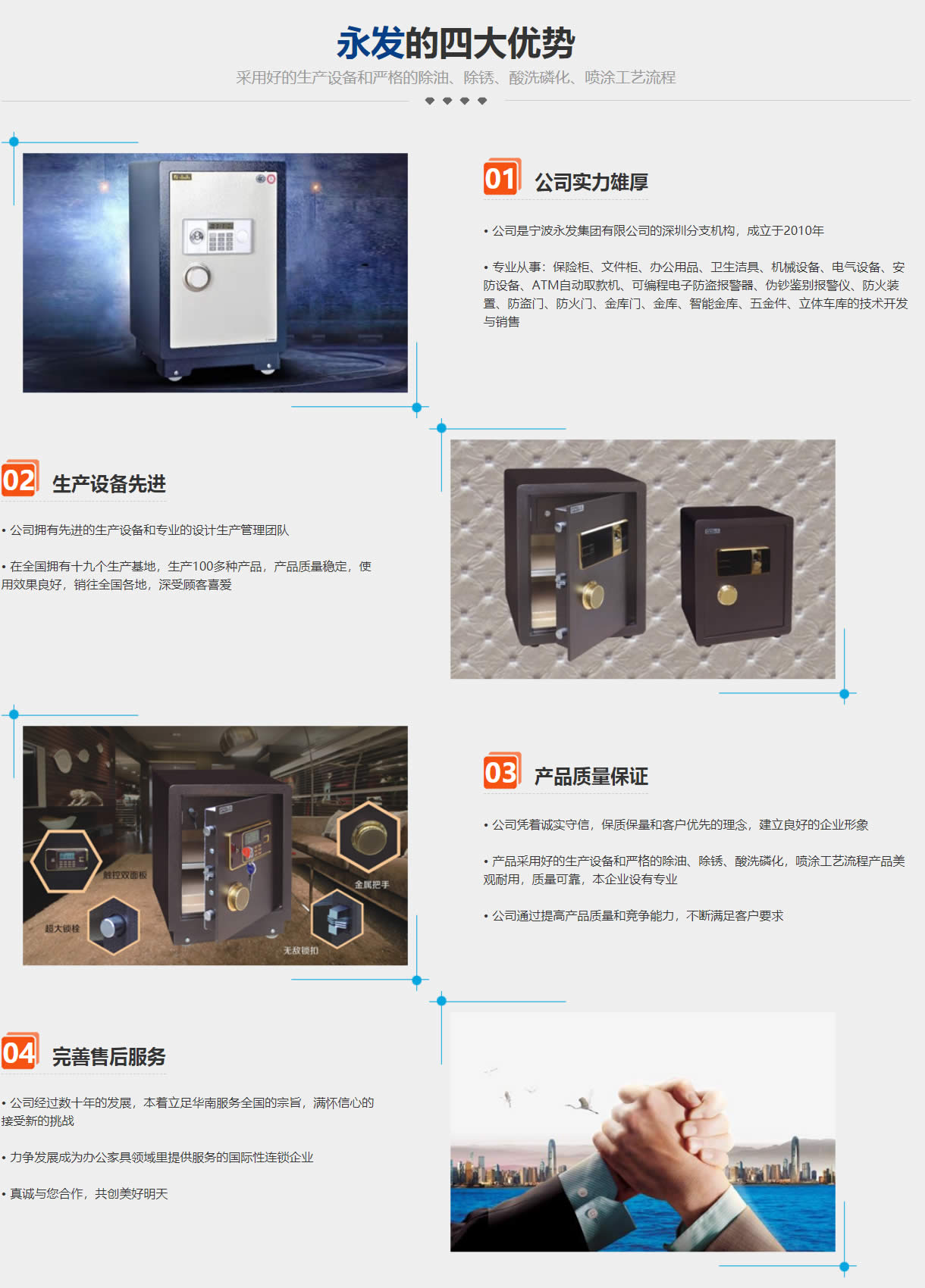 深圳永發(fā)安防產(chǎn)品有限公司 深圳永發(fā)安防產(chǎn)品有限公司,是寧波永發(fā)集團(tuán)有限公司的深圳分支機構(gòu),成立于2010年,專業(yè)從事:保險柜、文件柜、辦公用品、衛(wèi)生潔具、機械設(shè)備、電氣設(shè)備、安防設(shè)備、ATM自動取款機、可編程電子防盜報警器、偽鈔鑒別報警儀、防火裝置、防盜門、防火門、金庫門、金庫、智能金庫、五金件、立體車庫的技術(shù)開發(fā)與銷售。